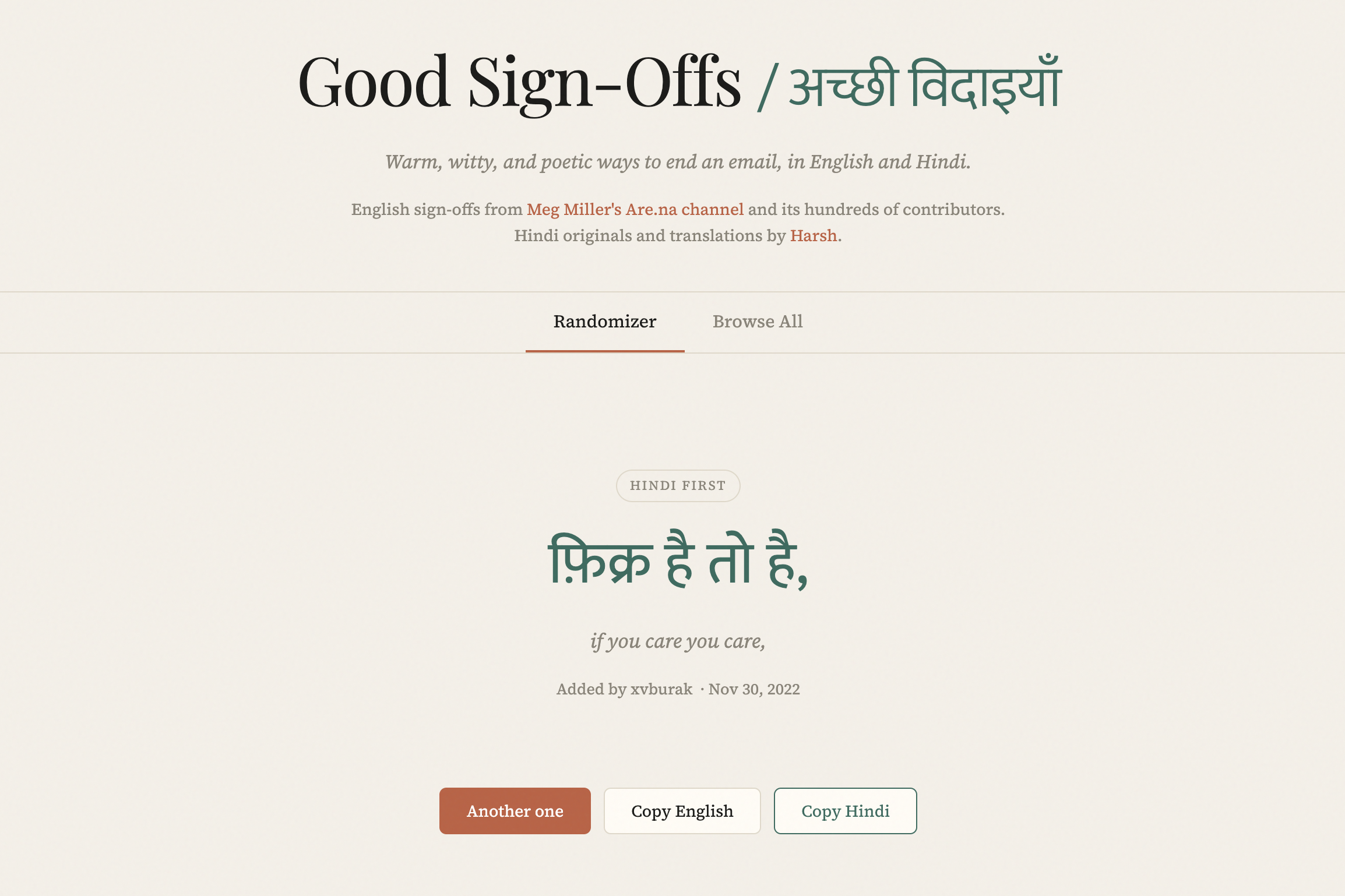 2,000+ English email sign-offs from Are.na and 40+ original Hindi sign-offs, in a beautiful randomizer.