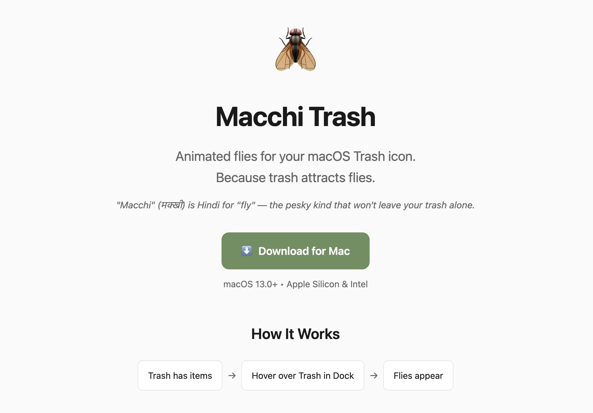 A tiny macOS menu-bar app that shows animated flies buzzing around your Trash when it has items.