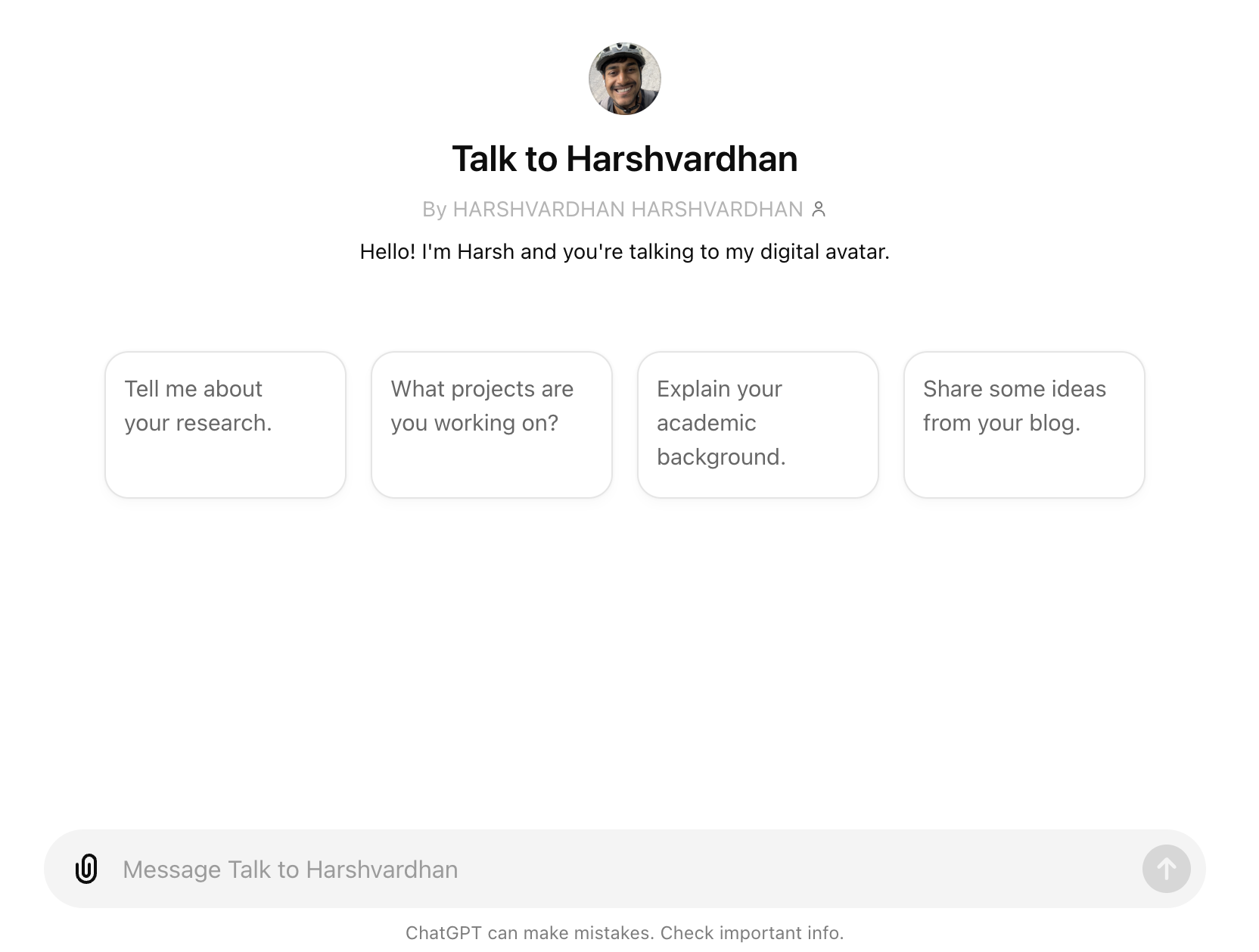 I created my digital avatar chatbot that you can talk to for free at https://harsh17.in/chat